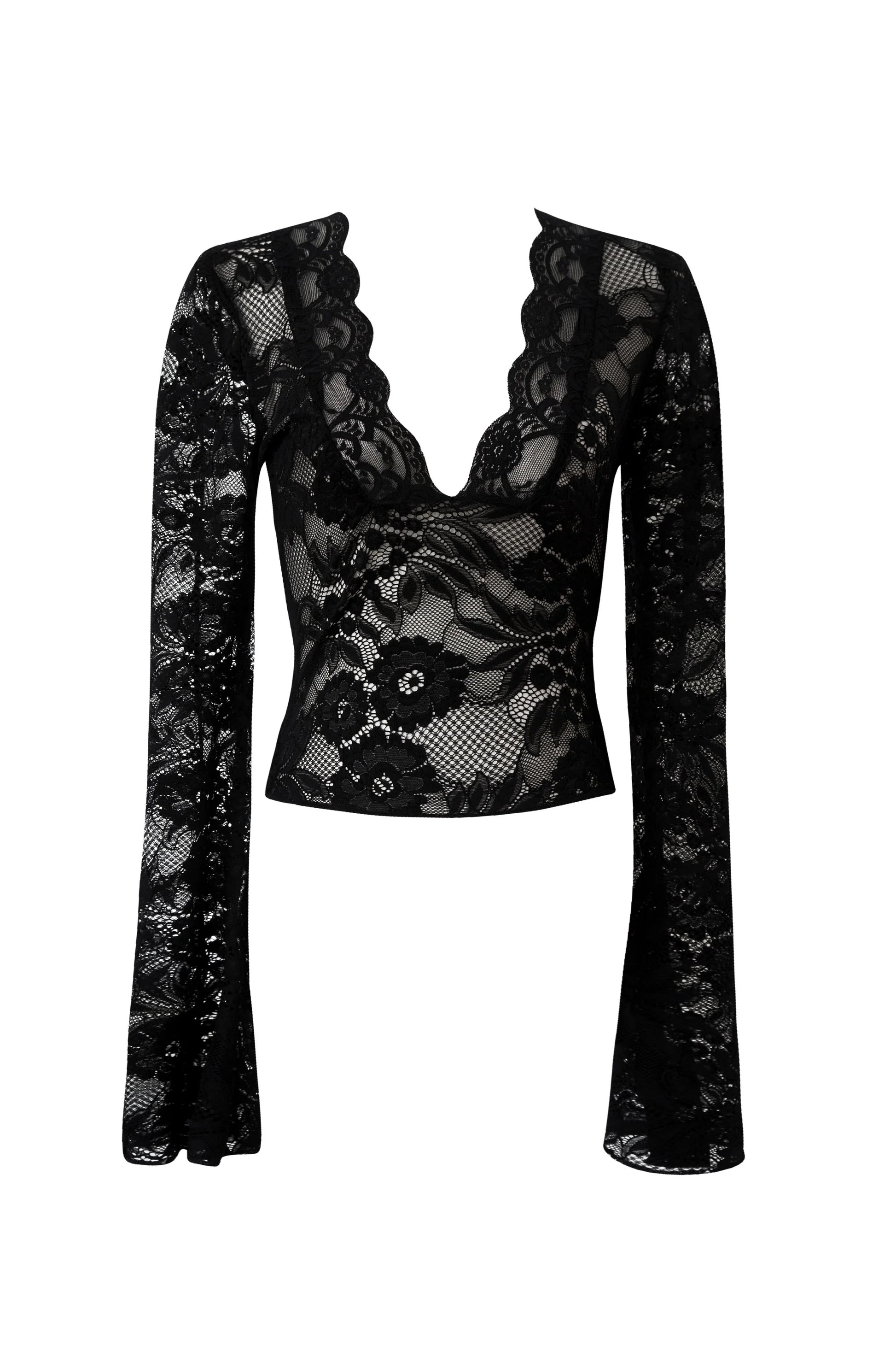 Seductive yet sophisticated, the Black Lace Long-Sleeve Top by Bellesse Essentials is a timeless wardrobe staple. Crafted from delicate floral lace, this piece features a deep scalloped V-neckline and sheer fitted sleeves, exuding effortless allure. The slightly flared cuffs add a touch of drama, making it the perfect statement piece for evening outings, date nights, or upscale events. Pair it with sleek trousers or a satin skirt for a bold yet elegant look.